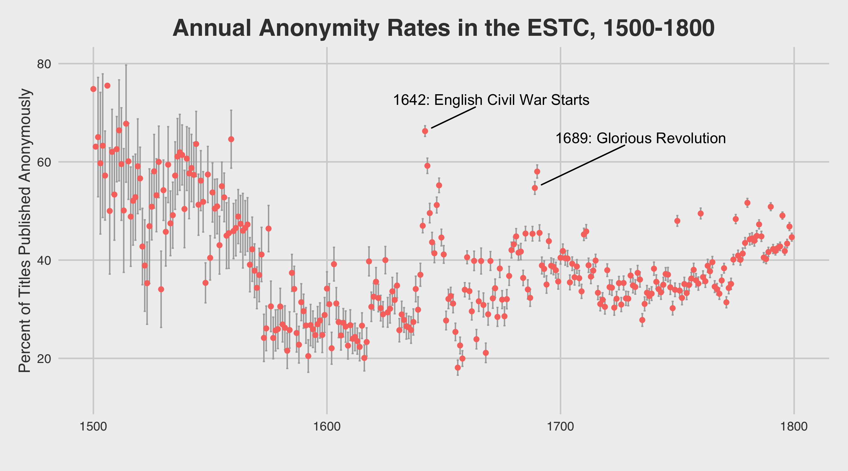 Little is known, however, about the particular social, economic, and religious concerns that motivated anonymous publication, or about the legal conditions that inspired and effectively curtailed the publication of anonymous works. Future computational work may begin to fill some of these gaps and chart the relationship between early copyright regulations and modern authorship practices more broadly.